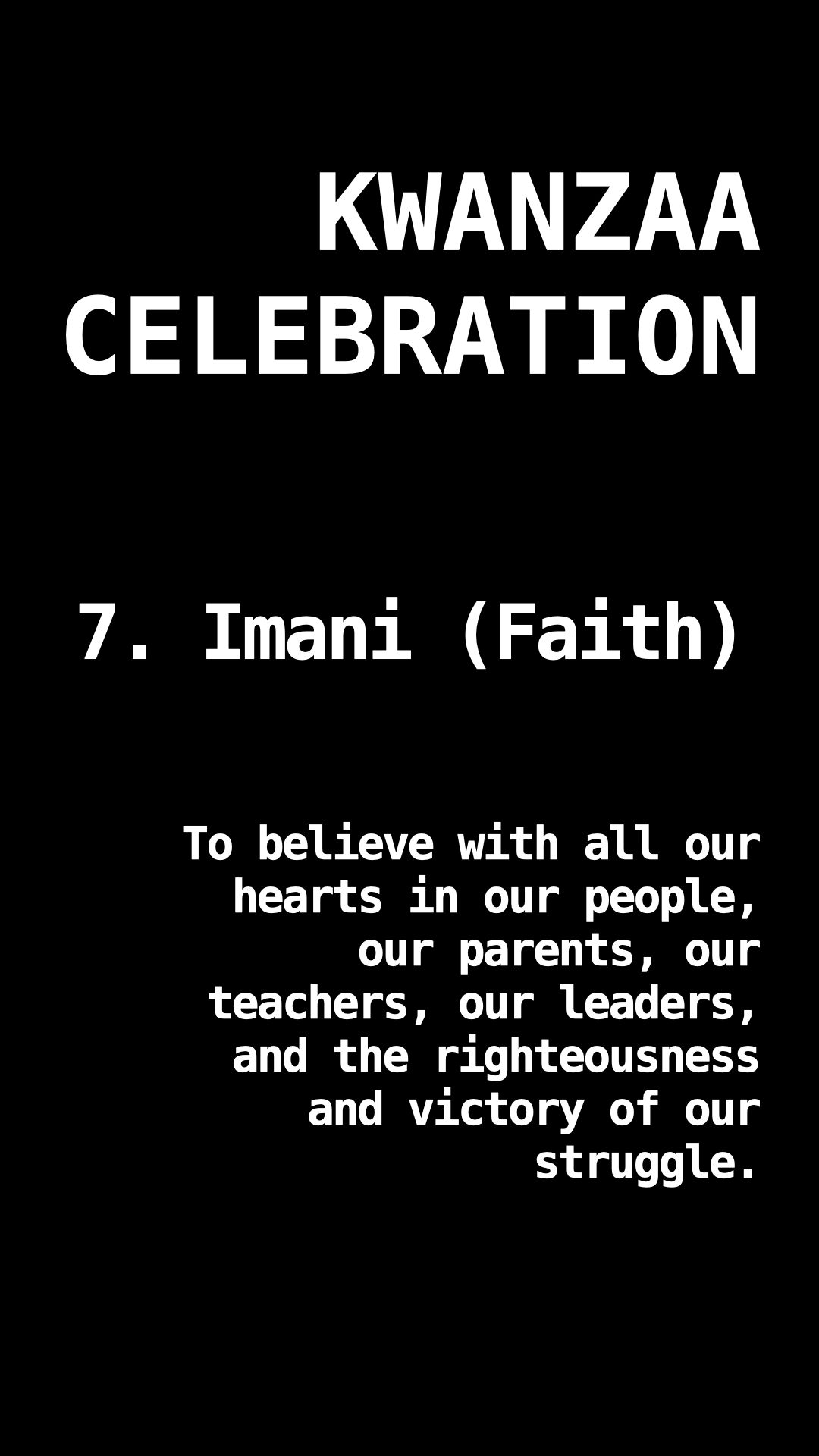 7. Imani (Faith): To believe with all our hearts in our people, our parents, our teachers, our leaders, and the righteousness and victory of our struggle.